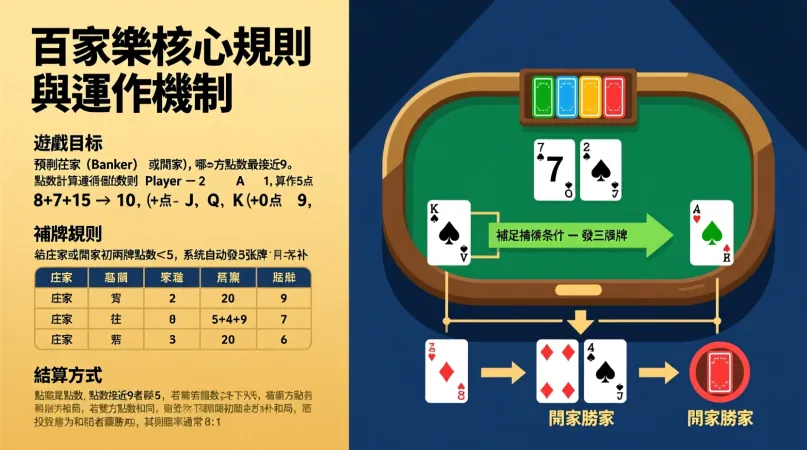 百家樂的核心在於「預測」莊家(Banker)或閒家(Player)哪一方點數最接近9。遊戲結構雖簡單,但卻蘊含統計優勢與投注心理學。
